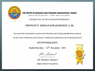 – นักจิตใต้สำนึกบำบัดขั้นสูง (Certified clinical hypnotherapist C.Ht.) จาก ศูนย์ค้นคว้าและฝึกอบรมพลังจิตใต้สำนึก- ฝึกอบรมการย้อนอดีตชาติบำบัด กับ นพ.ไบรอัน แอล ไวส์ ( Certified Past Life Regression Therapy, Weiss Institute, USA)